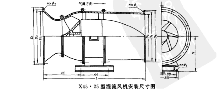 x45.25型斜流風(fēng)機(jī)外形及安裝尺寸